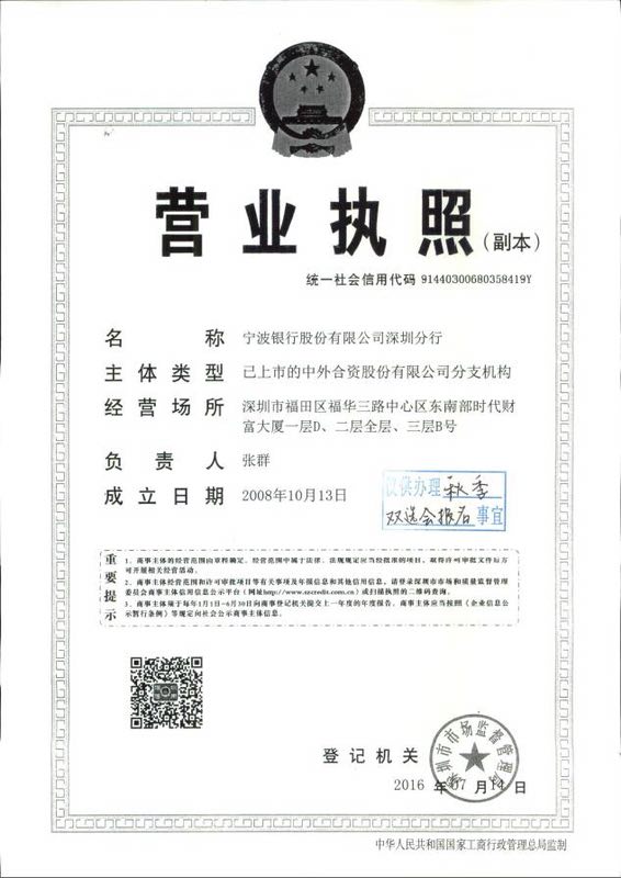 宁波银行深圳分行作为宁波银行第四家异地分行,成立于2008年11月20日,秉承宁波银行“诚信敬业,合规高效,融合创新”的企业文化,支持地方经济建设,扶持小企业发展,发展新兴金融市场业务,创新金融服务,助推特区经济发展。截止目前,共开设14个分支机构,包括营业部、龙岗支行、南山支行、宝安支行、龙华支行、后海支行、罗湖支行、财富港支行、布吉支行、科技园支行、光明支行、香梅社区支行、众冠社区支行、红荔社区支行。