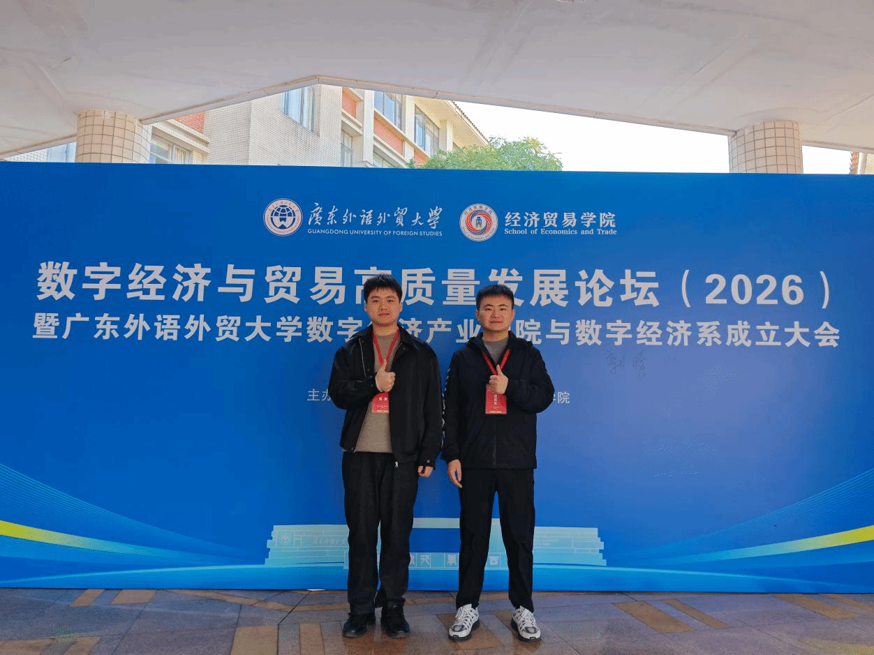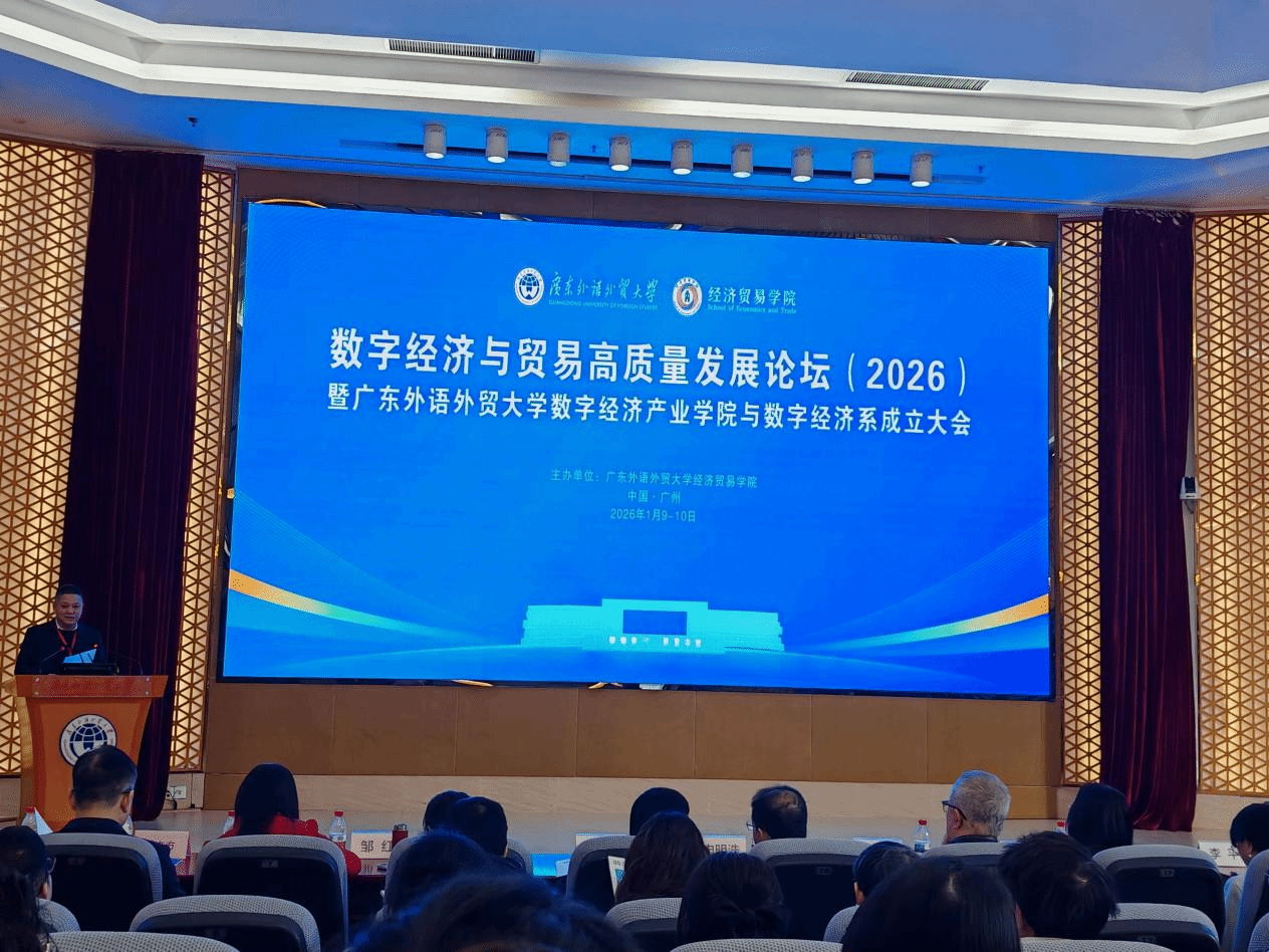 1月10日,“数字经济与贸易高质量发展论坛(2026)暨广东外语外贸大学数字经济产业学院与数字经济系成立大会”在广州隆重举行。本次论坛由广东外语外贸大学经济贸易学院主办,汇聚了来自全国高校、科研机构及企业的众多专家学者,围绕数字经济与贸易高质量发展的前沿议题展开深入研讨。yl88858永利集团研究生张鹏、王勇应邀参会,并在分论坛环节积极参与学术交流。