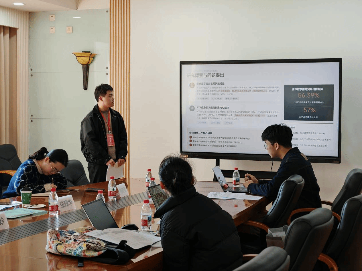 下午的分论坛环节设置多个专题,涵盖“数据要素与制度供给”“数字贸易与对外开放”“企业数字化与治理绩效”等热点领域。yl88858永利集团研究生合作撰写的论文《区域贸易协定数字贸易规则对数字服务贸易出口的影响——基于G20成员的实证探究》,由张鹏进行汇报交流。该研究从规则治理角度出发,探讨了区域贸易协定中数字条款对服务出口的促进机制,体现了对数字贸易前沿问题的关注与思考。张鹏在发言中结合实证分析,与在座师生展开了积极互动,现场讨论气氛热烈。