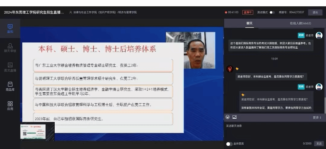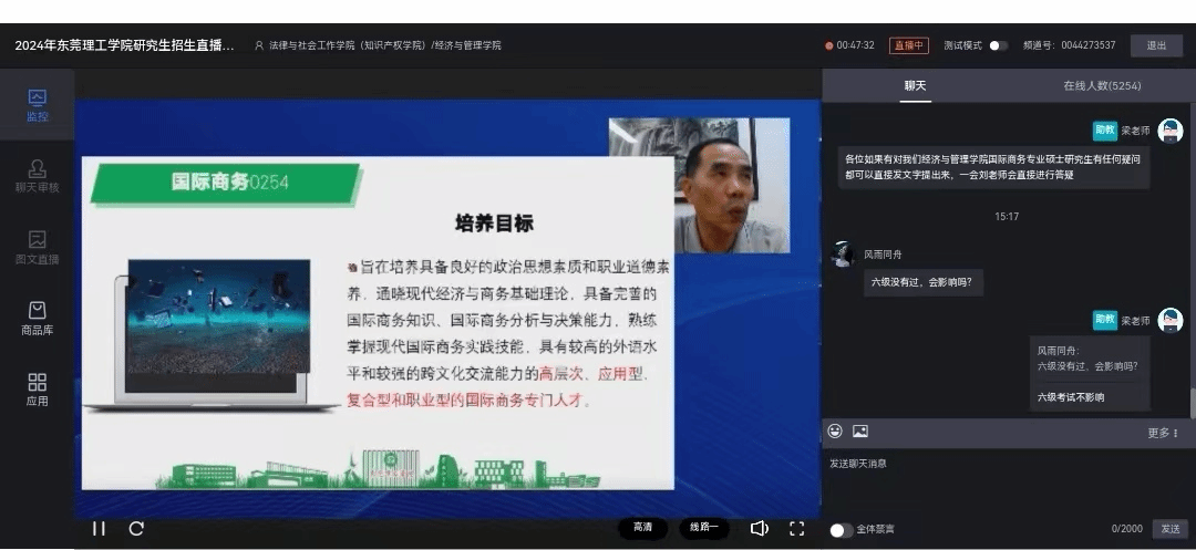 在随后的交流环节刘川副院长针对观众的疑问都进行了详细的解答,互动效果良好。此次线上直播宣讲会议的顺利开展,将进一步助力学院更好地推进国际商务专业硕士学生的招生工作。