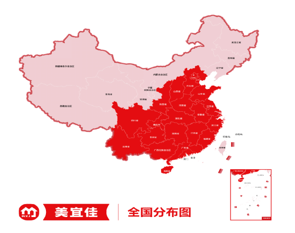 自1997年成立以来,美宜佳已经走过了26个年头,在26年的品牌发展历程中,美宜佳也在不断的创新、变革,以适应不同时期和需求下的市场。根据美宜佳品牌官方公布的数据显示,截至2022年11月,美宜佳全国门店规模达到了30000家,覆盖全国220个城市,每年净增2000—3000家店的速度。美宜佳主要分布在广东、福建、湖南、江西、湖北等二十个省市200多座城市。在2018年进入江浙沪地区之后,形成了广东、华中、华东、华北、西南五大发展区域,已成为国内规模较大的特许连锁便利店企业。