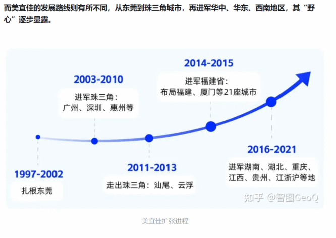 美宜佳于1997年成立之初就确定了特许加盟的发展模式,在深耕多年广东市场后,于2014年起陆续进入福建、湖南等省市,推进区域整合发展,至今已进驻全国20多省市。美宜佳通过建立店铺拓展与营运、采购与供应链、人力与财务等系统的复制能力,为区域性品牌全国化扩张之路打下坚实的基础,逐步建立起区域可复制能力,实现规模化效应,扩张之迅速,本土化品牌几乎无人匹敌。