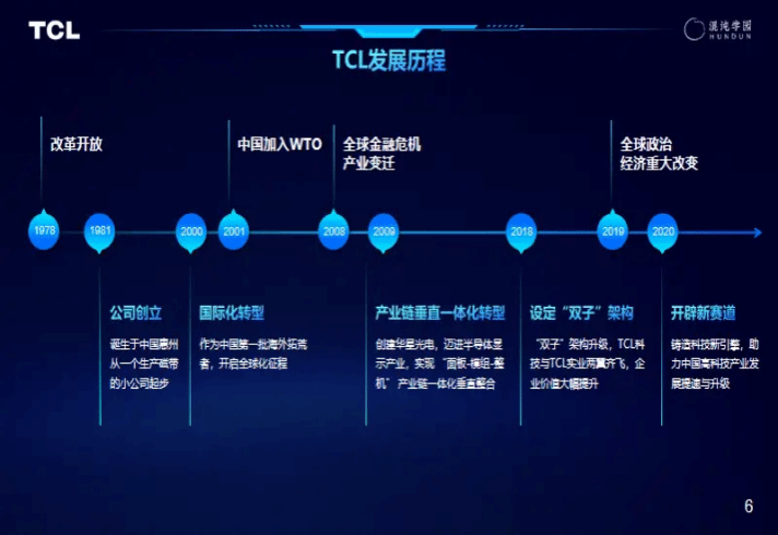 1998年,TCL首次导入经营变革管理创新观念,实现了从初创企业到现代化企业的成功转型。2002年,早期的探索也使得TCL有了跨国并购的能力,通过并购开启国际化经营变革,实现了从中国企业向国际化企业的跨越。2010年,通过建立TCL华星,开始进入半导体显示产业领域,这是TCL从终端产品制造向高科技、重资产、长周期的产业转型升级的重要时期。2017年,TCL明确发展技术密集、资本密集型产业的战略,确定了沿泛半导体产业链布局、支持国家战略新兴产业发展的战略方向推动全球领先能力建设变革。TCL通过内部组织瘦身、资源业务重新匹配、开辟第二增长曲线,对外引入专业机构助力等方式,实现了从业务到组织的一系列重大变革,企业再次成功转型,发展成为具有全球竞争力的智能科技产业集团。