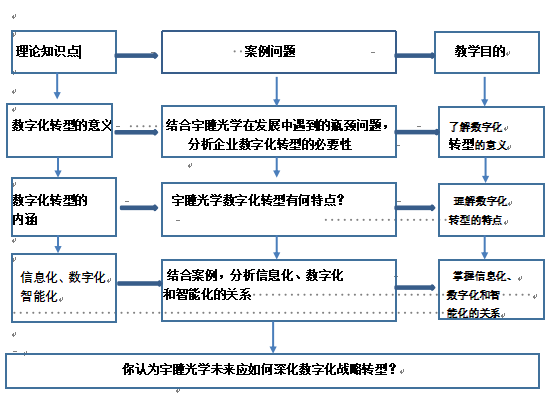具体来说,首先引导学员总结宇瞳光学通过数字化转型实现高质量发展的背景、过程和效果,进而探讨企业数字化转型的必要性(问题 1);通过对必要性问题的探讨,进一步引导学员思考企业数字化转型的内涵,分析总结数字化转型相关理论知识点(问题 2);引导学员深入思考信息化、数字化和智能化的关系(问题 3);最后结合宇瞳光学的数字化转型战略要求学员对企业的未来发展之路提出建议(问题 4)。本案例的分析思路与步骤见附录TN-1。