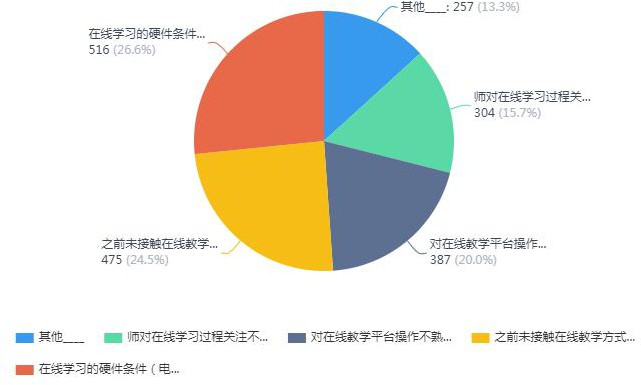 从任课教师提供在线学习资源的情况调查数据表示,65.4%的学生认为任课教师能提供丰富的在线学习资源(课件、视频、电子书等),这说明学生对在线学习资源的需求未能满足。任课老师在线辅导答疑、沟通交流方面,有66.8%的学生表示比较满意和满意;而影响学生在线学习效果的主要因素有:1.在线学习的硬件条件(电脑、网络等)匮乏,效率低下占26.6%;2.之前未接触在线教学方式,难以适应占24.5%;对在线教学平台操作不熟练占19.9%,3.老师对在线学习过程关注不够,缺乏引导占15.6%。从以上数据分析,个别任课教师在线教学态度有待提高,对学生课后学习任务要求还有待进一步加强。