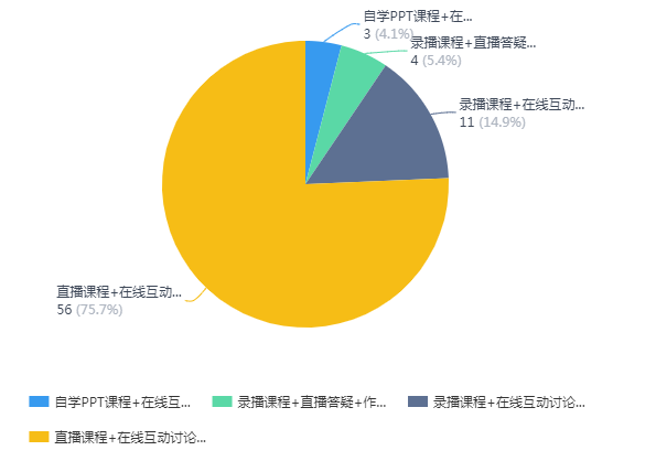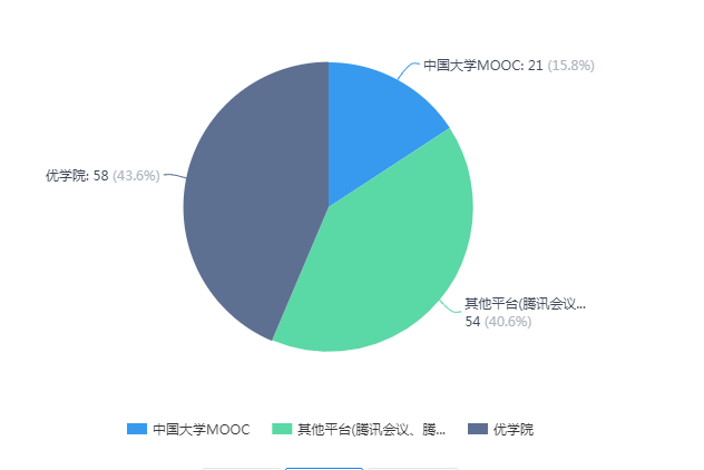 教师们的教学平台,从多到少依次是优学院网络平台、其他平台(腾讯会议、腾讯课堂、微信群聊、QQ群聊、Zoom等等)、中国大学MO0C(爱课程),其中,优学院网络平台、腾讯会议等占比高于中国大学MOOC平台。